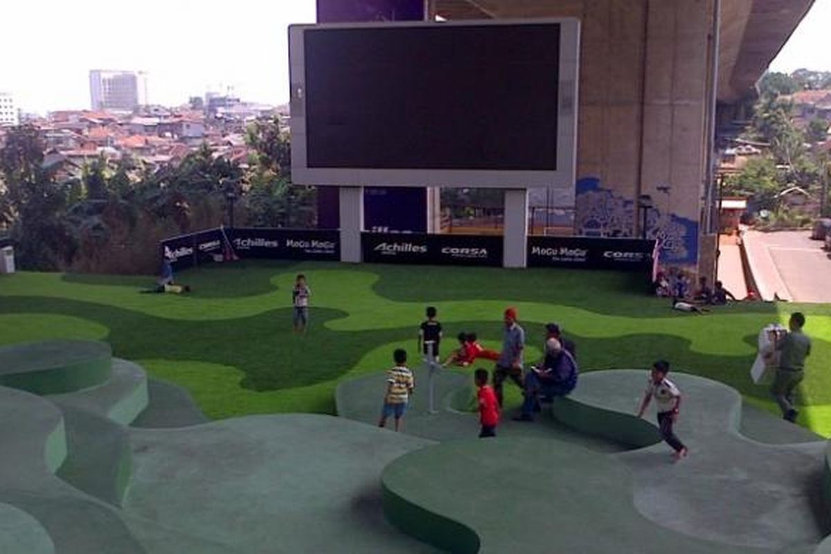 Gaung teriakan riang anak-anak yang bermain di atas rumput sintetis hijau mampu mengalahkan bisingnya kendaraan yang melintas. Tidak perlu khawatir untuk masyarakat yang tidak memiliki dana besar. Pasalnya, fasilitas umum ini tidak dipungut biaya, bahkan pengunjung bisa menonton film atau pertandingan sepak bola yang ditayangkan di layar videotron di taman ini.